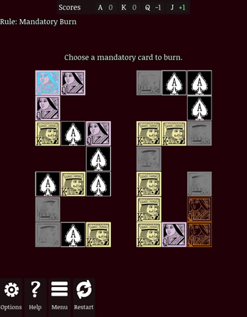 Collecting a card makes all cards of lower ranks inactive, indicated by a faded gray appearance. Inactive cards can no longer be collected (but are still eligible to be burned). The game ends when all remaining cards on the board are inactive. Some of the later designed boards use the mandatory burn rule, indicated by a dark red background. When this rule is active, you must burn an adjacent card whenever you collect a card; cards with no adjacent card to burn automatically become inactive. (You can also choose to use this rule for random boards.)